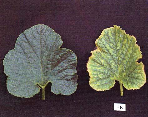 ◦ 잎의 생장이 느리고 아랫잎의 가장자리가 황화되기 시작하며, 더욱 심해지면 엽맥 사이도 황화됨