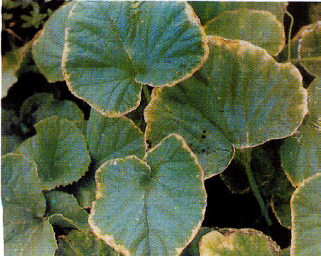◦ 엽맥을 남기고 황백화가 발생되는데 잎 가장자리에서 안쪽으로 진전됨