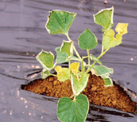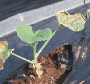 ◦ 암모니아가스 : 저농도에서 피해 잎은 검은반점무늬가 생기고 고농도에서는 급성피해로 백색의 반점무늬가 잎맥사이에 나타나거나 잎 전체가 백색으로 탈색되며, 야간에 접촉되면 잎 선산이 황백색으로 선을 이루며 말라 죽으며, 뿌리에 가스가 침투하면 뿌리세포가 파괴되어 지상부로 수분과 영양공급이 중단되어 말라죽고 줄기는 입고병 증상과 같이 잘록현상이 나타남