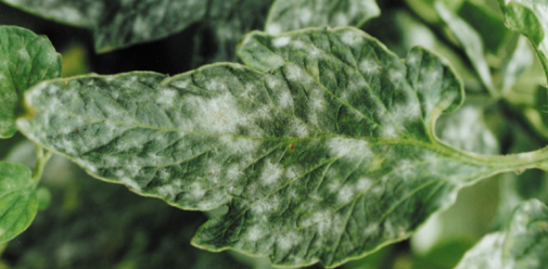 ◦ E. cichoracearum은 잎 앞면에 발생하여 처음에는 흰가루가 불규칙한 모양으로 점점이 나타나고 진전되면 잎 전체가 흰가루로 뒤덮힘