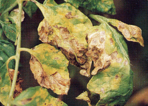 ◦ 잎자루와 줄기에서는 처음에 작은 점무늬로 나타나고 진전되면 병반이 감염부위를 둘러싸게 되고 그 위쪽은 말라죽게 됨