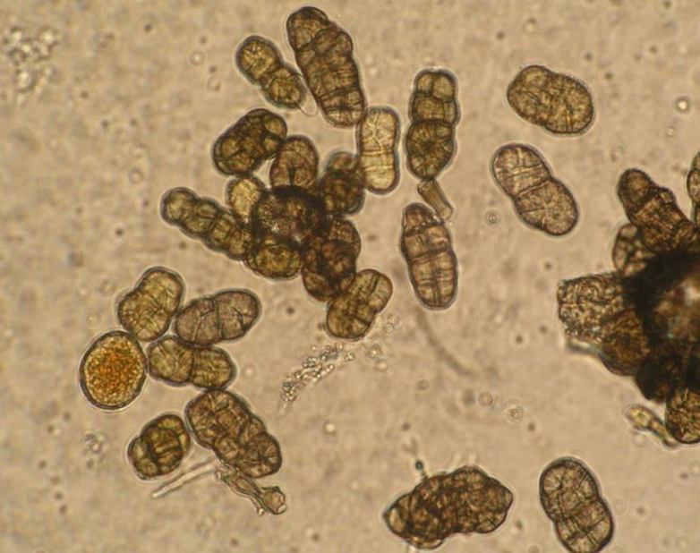 ◦ 불완전균에 속하며, 분생포자는 갈색, 한쪽이 둥글거나 약간 뾰족하며, 1~7개 횡격막과 여러 개 종격막, 주요 3개 횡격막 부위는 약간 오목하게 들어간 모양, 크기 28~64×14~24㎛임