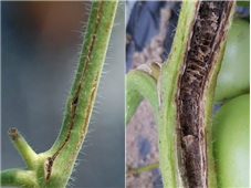 ◦ 줄기의 표면이 감염되면 표피가 갈라지고 궤양증상이 나타나며, 유관속이 감염되면 그루 전체가 시들어 죽고 병든 줄기를 가로로 잘라보면 유관속이 갈색으로 변해 있고 악취는 나지 않으며, 물에 담그면 세균이 거의 분출되지 않음