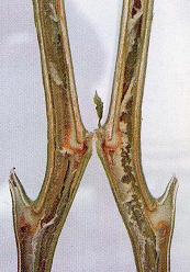 ◦ 진전되면 줄기의 속이 검게 썩어 공동이 생기며, 외부에는 수침상의 병반이 보이고 악취가 남