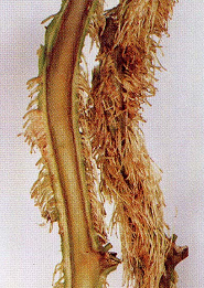 ◦ 줄기를 종단해 보면 속이 검게 변해 있고 유관속은 암갈색으로 변해 있으며, 줄기의 감염부위에는 많은 부정근이 형성됨