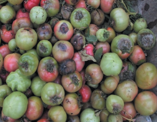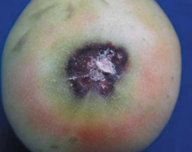 ◦ 수확기 과실의 배꼽 부위가 암갈색으로 변하면서 낙과되고 과실은 성숙 여부에 상관없이 발생하며, 칼슘 결핍에 의한 배곱썩음 증상과 유사하나 배꼽썩음 증상과 달리 배꼽 부위가 함몰되지 않고 피해 부위에 옅은 분홍색 곰팡이가 형성됨