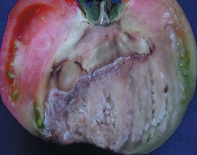 ◦ 과실을 잘랐을 경우 내부까지 갈변되어 있으며, 과방과 씨앗까지 분홍색 곰팡이로 뒤덮혀 있음