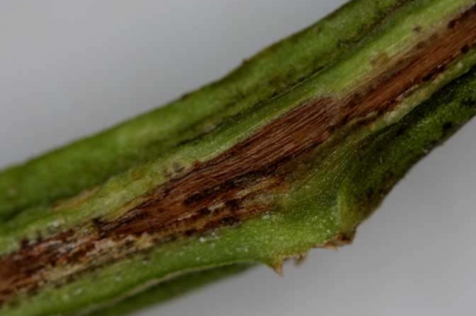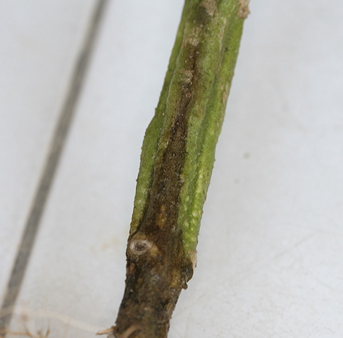 ◦ 줄기 내부 유관속 갈변은 줄기 밑부분 뿌리부패 부위로부터 상부로 진전되나 갈변길이는 보통 약 10cm 내외임