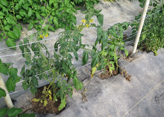 ◦ 촉성재배의 주 병징은 주로 제3화방의 과일이 형성되는 시기에 아랫잎이 황화되기 시작하여 점차 상위잎으로 확산되고 줄기 선단부의 어린잎이 낮에는 시들고 야간에는 회복되는 증상을 되풀이하다가 결국 말라 죽음