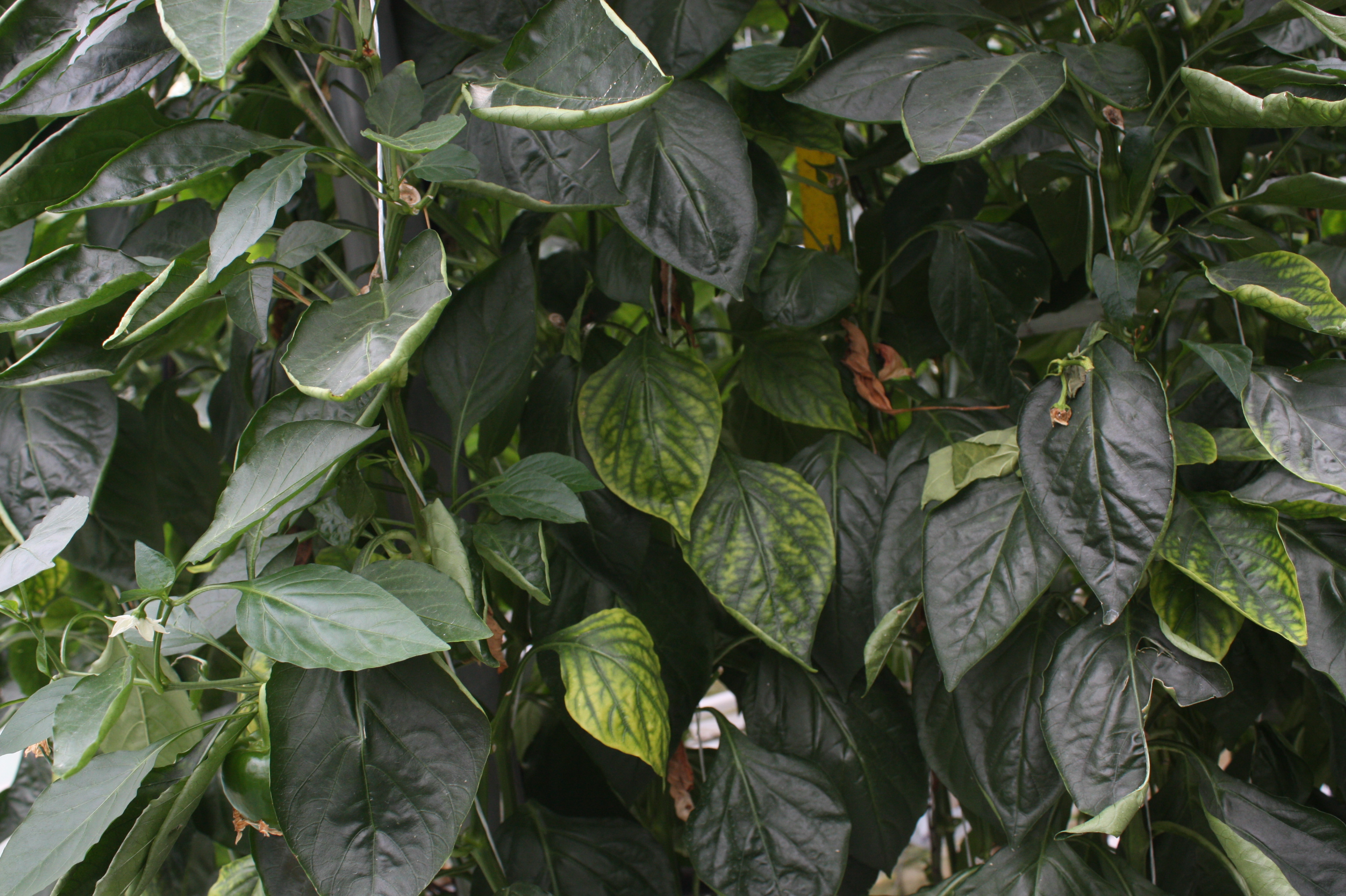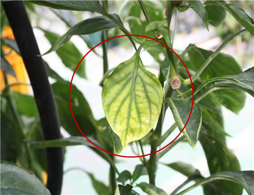 ◦ 중·하위엽에서부터 발생하기 시작하여 잎이 연하게 퇴록되는 증상을 나타내며, 생육이 부진하고 개화수와 열매수가 감소하여 진행이 되면 상부 어린잎에서도 증상이 관찰됨