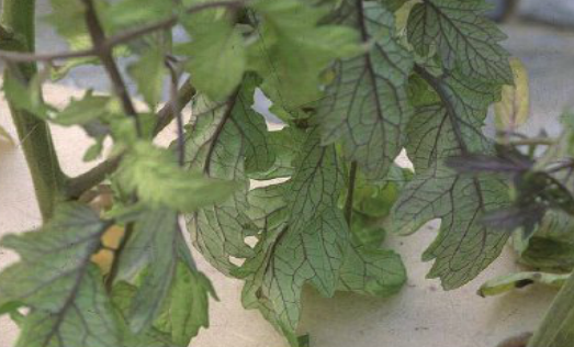 ◦ 식물체 전체의 생육에는 특별한 이상이 보이지 않지만 중~상위의 엽색이 담록색으로 변하고 잎 뒷면은 잎맥이 암적색으로 뚜렷함