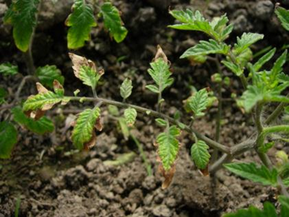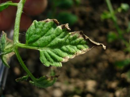 ◦ 잎 가장자리가 흑색으로 변하고 안쪽으로 타들어가는 증상을 나타내며, 엽맥 사이 엽육의 일부에도 흑갈색 반점이 생겨 타들어가는 증상을 나타냄