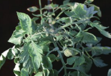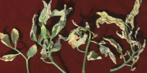 ◦ 줄기는 굽어지고 굽어진 줄기 뒷면이 코르크화 되어 다른 증상과 구분되며, 잎과 줄기는 경화되어 부러지기 쉽게 되고 과일 표피도 코르크화 되는 경우가 있음