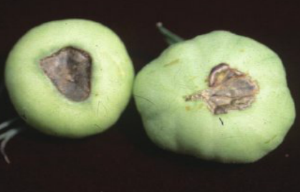 ◦ 토양을 건조하게 관리하거나 공중습도가 낮고 고온 및 건조에 의해서 석회의 흡수 및 식물체내의 이행이 원활치 못할 경우 많이 발생함