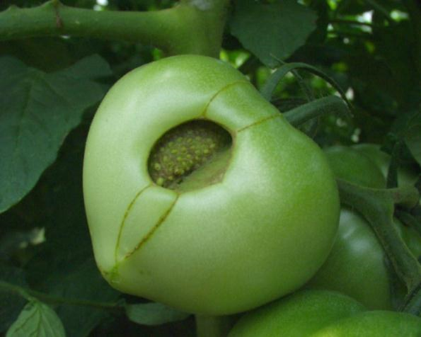 ◦ 과실의 꼭지 부분에서 아랫부분까지 코르크화한 지퍼모양의 선이 생기고 증상이 심한 것은 이 선상에 구멍이 뚫려 태좌부분이 드러나 보임