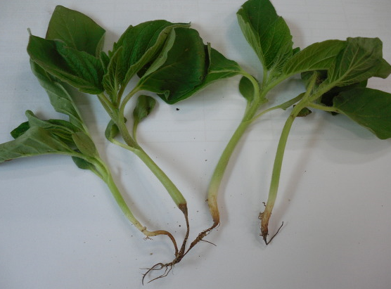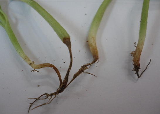 후자는 어린모가 지상부에 나타난 후 땅과 닿는 부분의 배축과 어린모의 줄기 밑부분에 감염되어 회갈색으로 변색되어 넘어지고 나중에 까맣게 되어 죽음