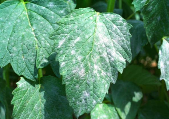 ◦ 처음에 군데군데 흰가루 모양의 균사가 나타나고 심해지면 잎 전면에 흰가루 모양의 균사체로 뒤덮힘
