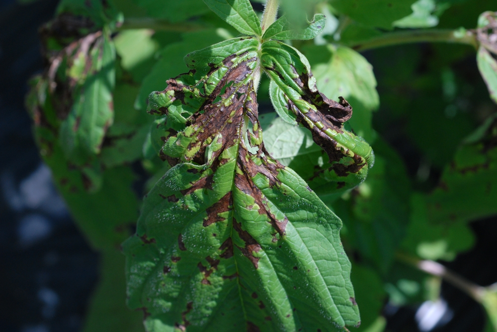 ◦ 잎에서는 초기에 수침상의 작고 불규칙한 형태의 점무늬로 나타나고 진전되면 갈색 내지 암갈색의 부정형 병반으로 확대되며, 심하게 병든 잎은 변색되어 마르고 일찍 떨어짐