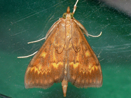 ◦ 암컷은 연한 황색에서 적갈색을 띠며, 앞날개는 황색 바탕에 물결 모양의 갈색 무늬가 있어 조명나방과 비슷함