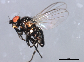 ◦ 성충은 길이 3.5mm 정도의 조그만 파리로서 광택이 있는 흑색을 띠며, 가슴의 등면은 회갈색 가루로 엷게 덮여 있어 광택이 약간 적음