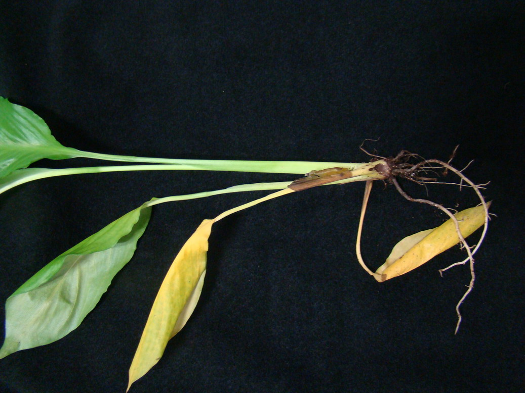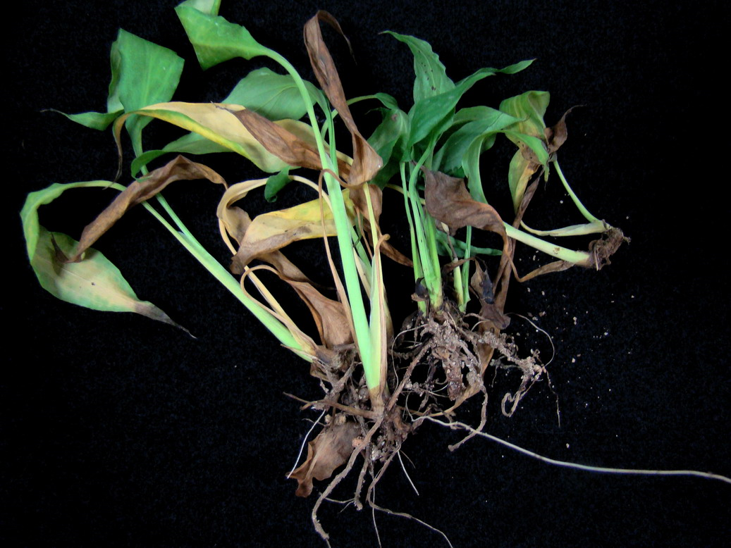 ◦ 처음에는 오래된 잎이 생기를 잃고 시들며 황화되는 증상을 보이다가 차츰 잎이 말라죽고 감염된 잎자루의 기부가 썩음