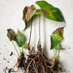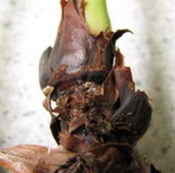 ◦ 심하면 잎과 줄기기 부패하여 세균덩어리가 누출되며, 아랫잎이 노랗게 되고 새 잎은 색깔이 희미해짐