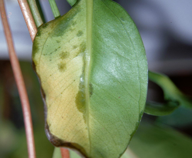 ◦ 잎 가장자리에서 반점이 생기고 잎 뒷면 및 주맥 주변으로 점액이 누출됨