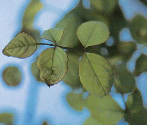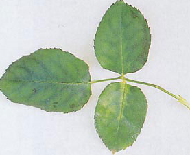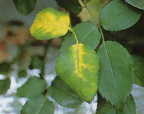 ◦ 오래된 잎에 황백화가 나타나고 이것은 엽병에 가까운 중륵(주맥) 주변에 발생함