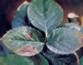 ◦ 주로 잎 끝 혹은 가장자리로부터 발생하며, 원형 내지 부정형의 암갈색 반점을 형성하고 심하게 진전되면 잎이 고사함