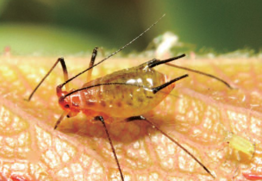 ◦ 무시충은 약 3.4mm로 몸빛깔은 녹색을 띠고 머리는 연한 갈색이며, 앞가슴과 가운데가슴은 초록색에서 등적색을 나타내고 배는 황록색에서 초록색이며, 가슴과 배의 앞쪽은 어두운 갈색을 띠는 경우가 많음