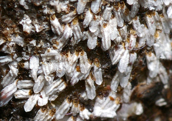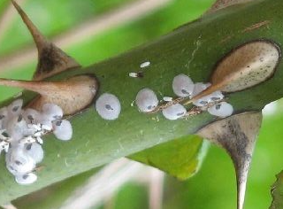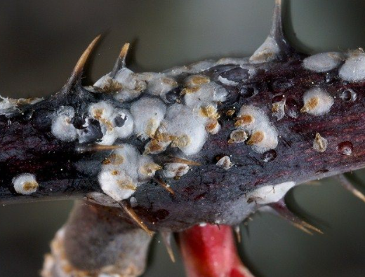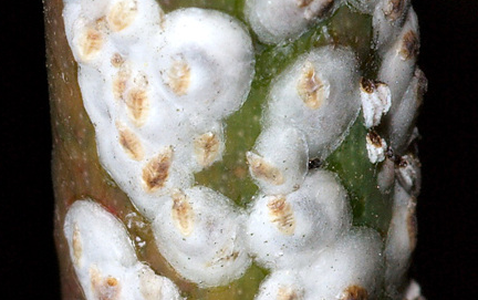 ◦ 주로 하단부의 오래된 가지나 줄기에 붙어서 흡즙하고 발생이 많을 경우 줄기 전체가 흰가루를 뒤집어 쓴 것 같이 보임