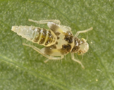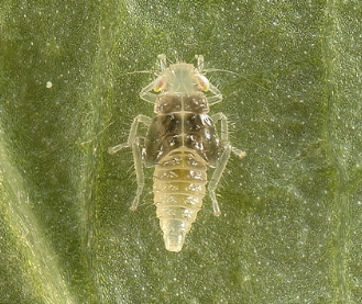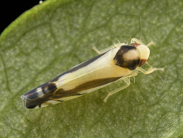 ◦ 성충의 크기는 3.3mm 내외로 머리와 다른 부분은 황색이고 머리가 앞쪽으로 돌출되어 있으며, 가슴 부분에 V자형의 짙은 갈색무늬가 있음