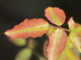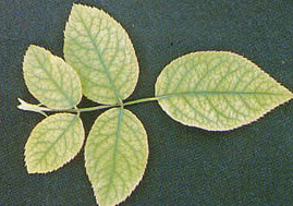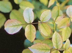 ◦ 신초의 신엽이 황적색을 띠고 엽연에는 적색이 남고 엽맥간 황백화가 나타나기 시작하여 엽연은 적색은 사라지고 서서히 황백화가 되며, 이러한 증상은 철 결핍증과 유사하지만 철 결핍증보다 심하지 않음