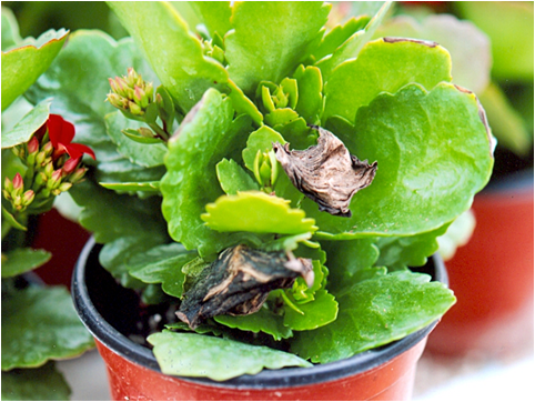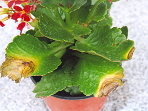 ◦ 잎 가장자리 부위가 수침상으로 물러지고 시들면서 안쪽으로 말라 죽음