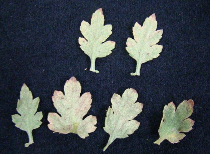 ◦ 주로 잎 뒷면에서 가해하여 황색 또는 흰색의 반점이 생기고 피해가 심하면 잎 전체가 황갈색으로 되어 조기 낙엽됨