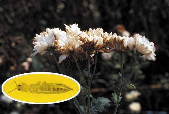 ◦ 꽃봉오리가 열리기 시작하면 유충과 성충이 봉오리 안으로 들어가 가해하고 꽃잎이 어릴 때 흡즙한 상처 부위는 꽃잎이 전개되면서 착색이 제대로 되지 못하여 줄무늬의 흰 반점이 생기거나 기형이 되어 상품성이 떨어짐
