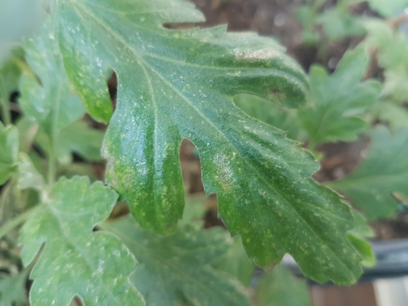 ◦ 어린 잎이 피해를 받으면 잎 가장자리가 곧바로 펴지지 못하여 삐뚤어진 잎으로 전개되고 엽맥도 쭈그러짐