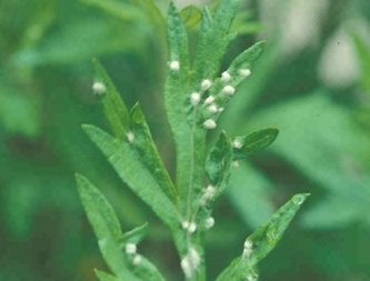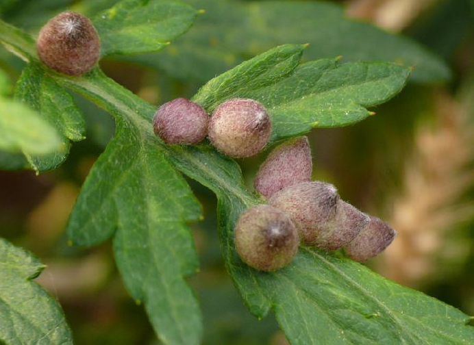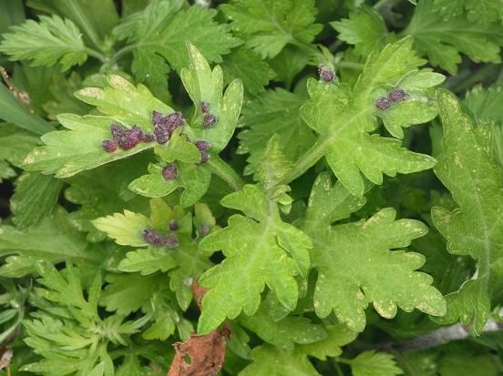 ◦ 피해를 받은 국화 잎은 기형이 되고 경미한 피해의 경우 피해 엽의 앞면에 삼각뿔 모양의 흰색 혹이 나타나며, 심할 경우 잎이 말리고 꽃이 비틀어지며, 가지에서는 수많은 혹이 형성되어 구불어지고 여러 개의 혹이 형성되어 혹덩어리가 되기도 함