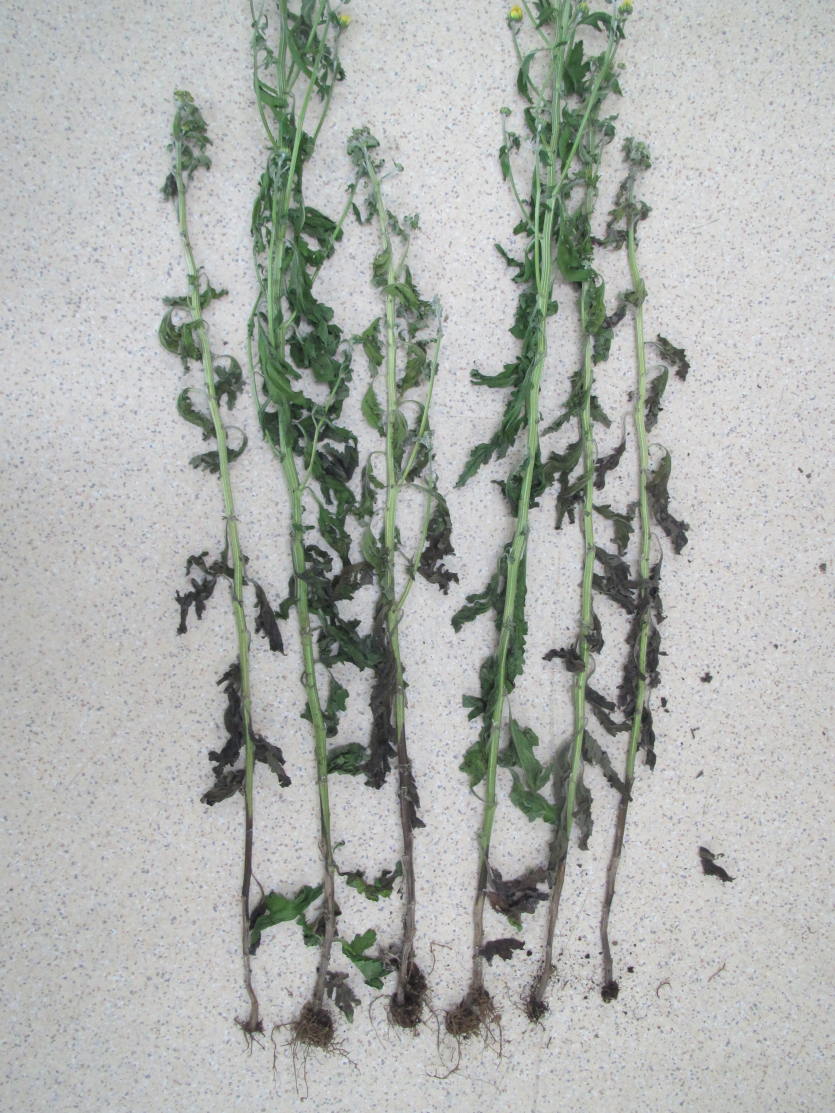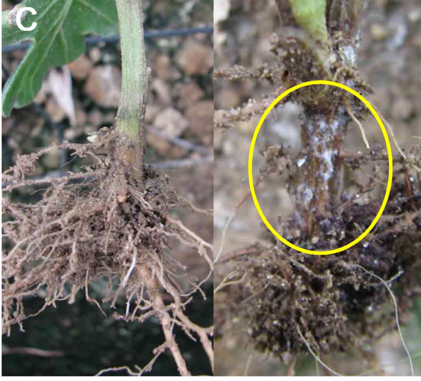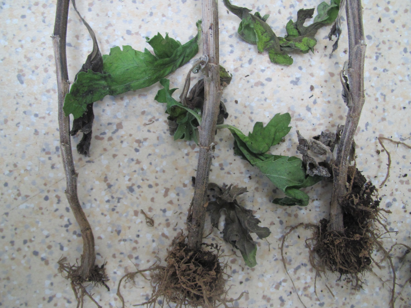 ◦ 초기에 시들음 증상을 보이다가 지제부에 갈색 또는 암갈색의 갈변 증상을 일으키고 진전되면 관부썩음, 뿌리썩음. 시드름, 잎마름 증상이 나타나며, 결국 식물체가 고사함